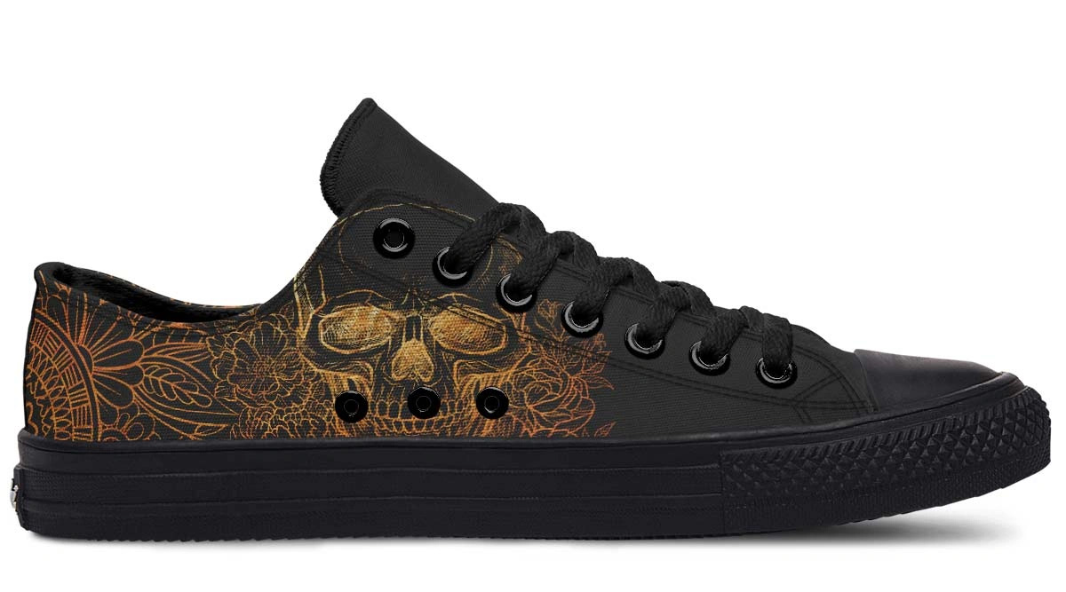 Experience the perfect blend of luxury and minimalism with our Gold Foil Skull Pattern (No Label Print) Black Lowtop Sneakers. These unbranded shoes offer a sleek, clean aesthetic, allowing the vibrant gold foil skull design to take center stage without distracting logos. Built for the fashion-forward individual, they feature a lightweight construction and comfortable insoles suitable for all-day wear. Whether paired with jeans or joggers, these minimalist skull sneakers provide a sophisticated yet edgy look for any modern streetwear wardrobe.